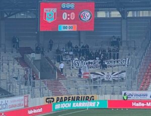 Zur Pause musste der Elversberger Torschütze das Feld nach einem Tritt in die Achillessehne verletzt verlassen. Das beeindruckte den Aufsteiger aber nicht wirklich. Ob gegen viertel nach drei in den Festzelten auf der Wiesn im fernen München die Stimmung ein wenig nachließ, ist nicht überliefert. Auf jeden Fall rutsche zu diesem Zeitpunkt 1860 wieder auf Platz 2 der Tabelle: Jannik Rochelt traf zum 1:2. Den Deckel auf Auswärtsieg und fortgesetzte Tabellenführung machte das Team der Stunde in der 72. Minute drauf und traf zum 1:3. 5.500 Zuschauer in Halle staunten.