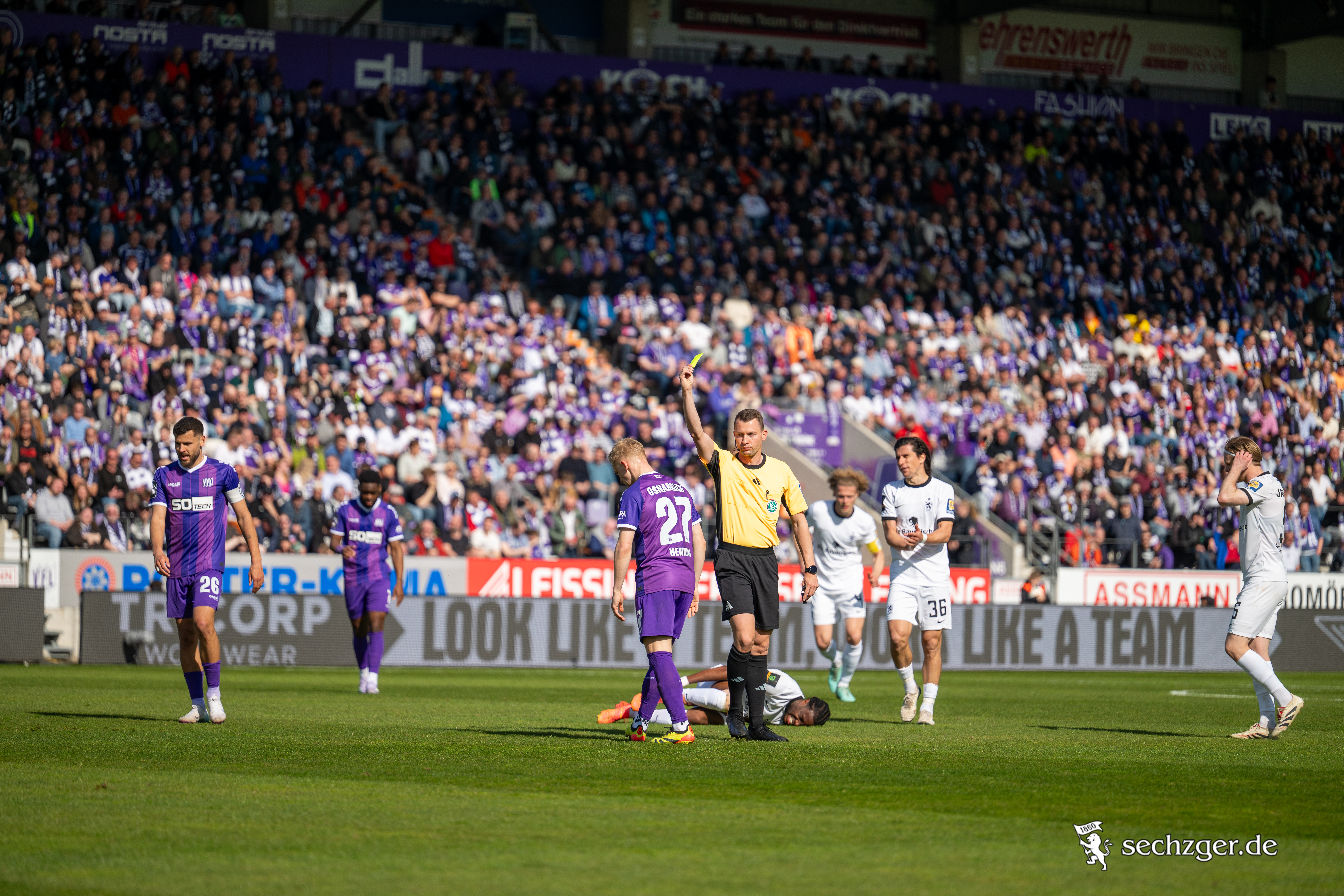 Titelbild: Die letzte Begegnung zwischen den Löwen und Florian Lechner in Osnabrück am 29. März diesen Jahres. In der 30. Minute sieht der VfL-Spieler Bryan Henning nach einem Foul an Anderson Lucoqui Gelb.