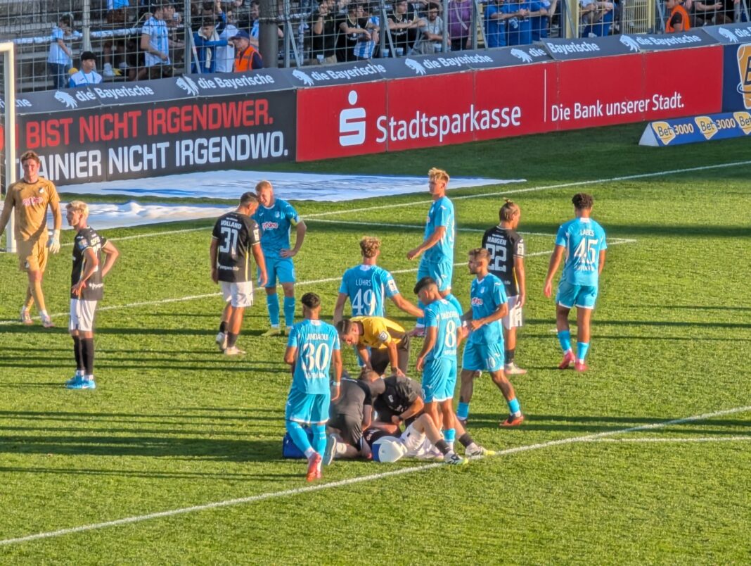 Titelbild: Ein Löwe im Hoffenheimer Strafraum am Boden. Cristian Ballweg beobachtet die Behandlung von Thore Jacobsen am 20. September 2025 beim 1:5 des TSV 1860 gegen Hoffenheim II.