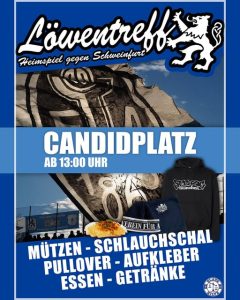 Der Löwentreff am Candidplatz startet am Samstag bereits um 13:00 Uhr. Zum Essen gibt es Käsespätzle, außerdem stehen die üblichen Getränke sowie Glühwein zum Kauf bereit. Erhältlich im Shop ist neue Wintermütze für Mitglieder des “Mein Verein für alle Zeit”-Kollektivs, Schlauchschals sowie die bestickten Kapuzenpullover vom letzten Mal. Wer noch kein Mitglied ist, kann sich vor Ort anmelden.