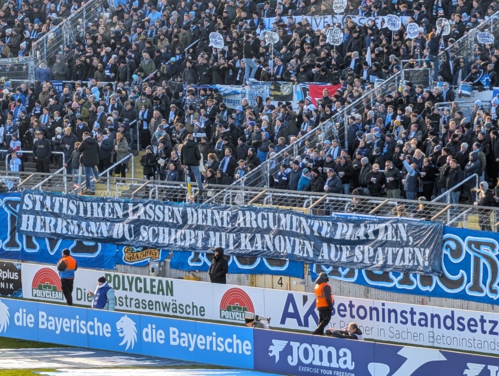 Das Hinspiel in München verlief durchaus erfreulich. An einem sonnigen Novembertag brachte Patrick Hobsch die Löwen früh in Führung (13.). Vorausgegangen war eine schwache Abwehr von FCS-Goalie Menzel. Außerdem stand Phillip Maier nach längerer Zeit ohne Chance auf Einsätze wieder einmal in der Startelf. Zu Beginn schweigen beide Fanlager für 12 Minuten, als Zeichen des Protests gegen geplante Maßnahmen der Innenministerkonferenz.