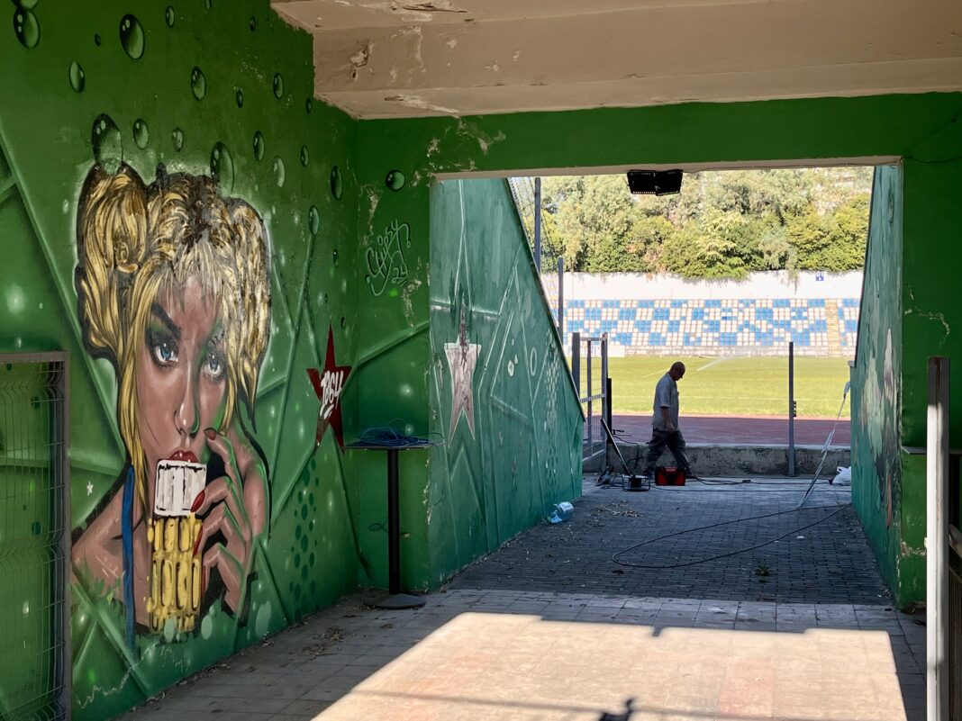 Nach einem Tag Fußballpause standen dann am Samstag gleich zwei Partien auf dem Programm. Ein Zweit- und ein Erstligakick. Los ging’s in der Stadt Fier etwa 85 Kilometer Luftlinie südlich von Tirana. Ein netter, aber – wie eigentlich die allermeisten Stadien im Land – schon sehr in die Jahre gekommener Ground mit einer Stahlrohrtribüne, auf der sich samstags um vier eine niedrige dreistellige Anzahl an Zuschauern einfand. Viel Emotion auf dem Rasen und am Ende ein schiedlich-friedliches 1:1, das sich die Gastgeber mit einer couragierten Leistung in den Schlußminuten noch wacker und verdientermaßen erkämpften. Sechs Euro hatte uns der Spaß gekostet – und das war er auch Wert. Wir düsten direkt nach dem Abpfiff die 49 Straßenkilometer in Richtung der kleinen Stadt Rrogozinhe, Heimat des amtierenden albanischen Meisters.