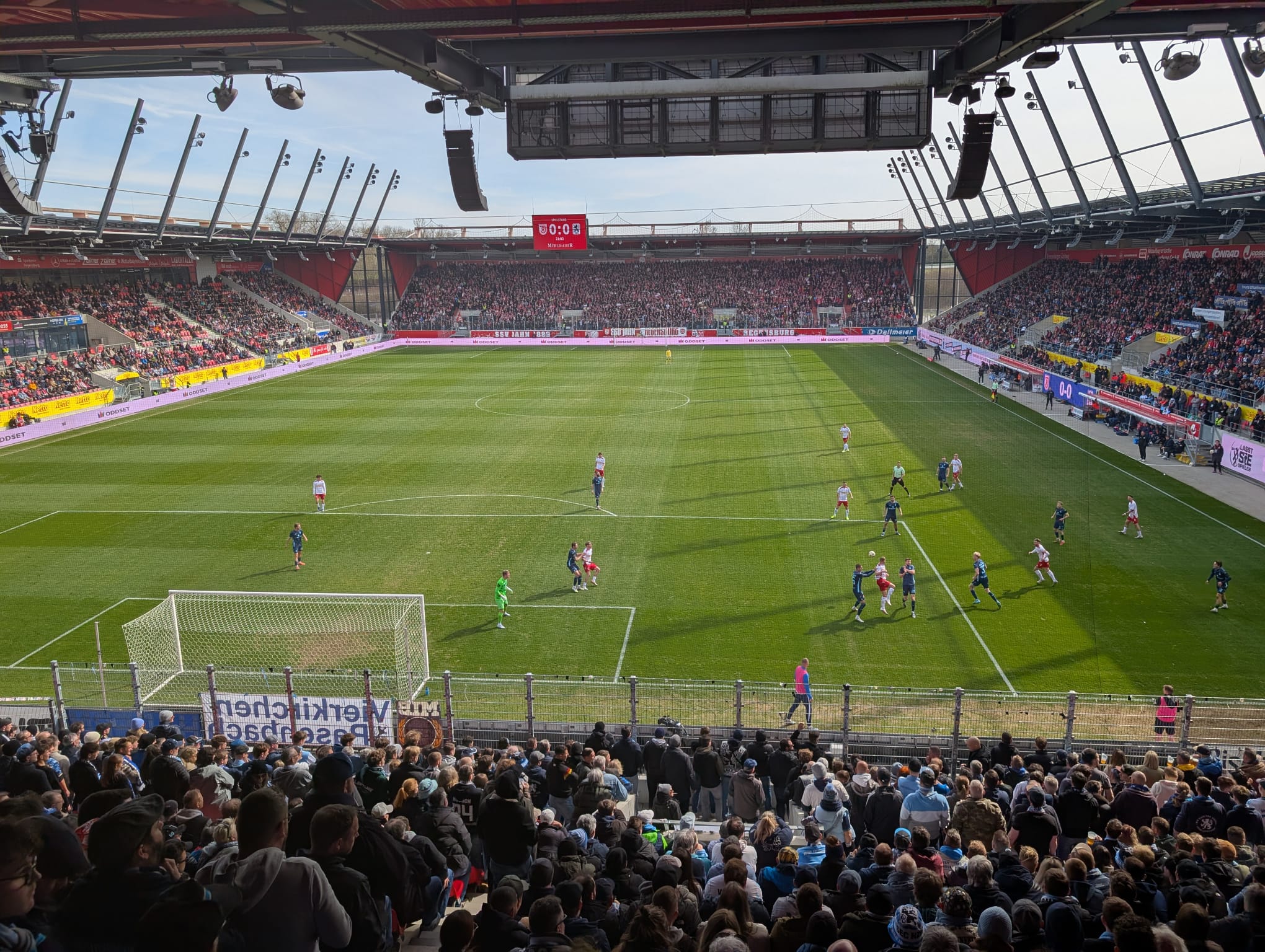 In der letzten Viertelstunde des ersten Durchgangs berappelten sich die Sechzger wieder etwas und taten auch wieder mehr für die Offensive. Fußballerisch war es aber mehr als überschaubar, was beide Seiten auf den Rasen brachten. Die Löwen versuchten sich zu oft mit langen Bällen, was viel zu durchschaubar war. Regensburgs Konter waren oft zu lang ausgespielt, deutlich torgefährlicher waren dennoch die Heimischen. Bei einer Glanzparade von Dähne kurz vor der Pause bei einem Kopfball nach Freistoß der Oberpfälzer lag die Regensburger Führung mehr als nur in der Luft. Am Ende rettete Dähne den Löwen das schmeichelhafte Remis in die Pause.
