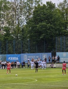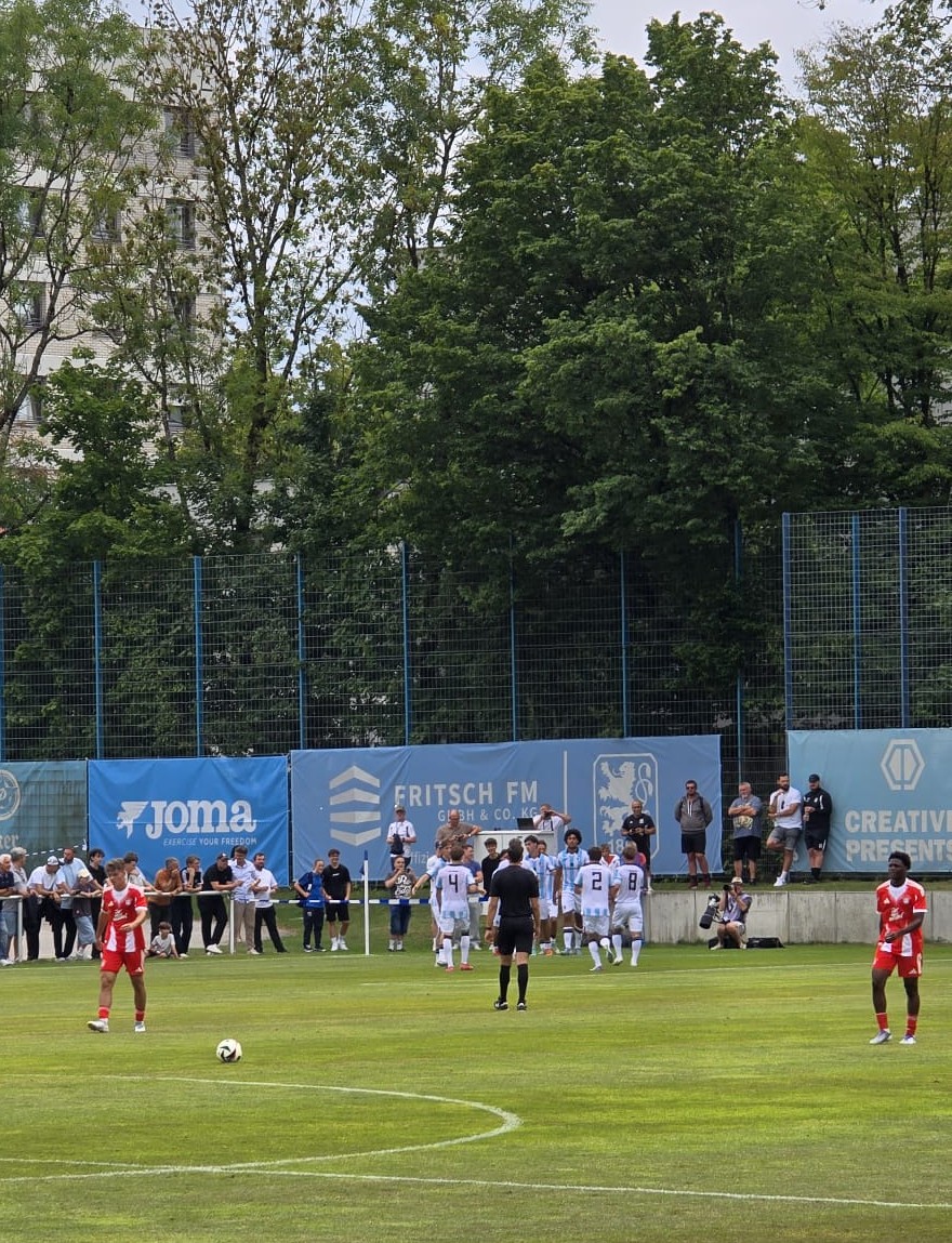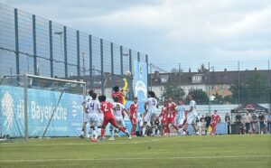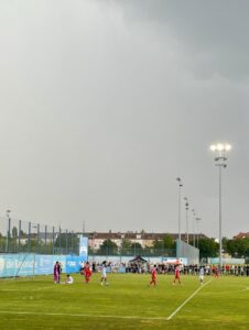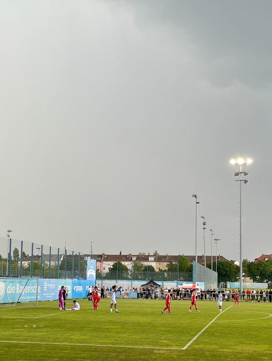 Als es – bei noch gutem Wetter und nur leichter Bewölkung – etwa fünf Minuten verspätet losging, erwischten die Gäste aus der Seitenstraße den besseren Start. Sie drückten – nach ein paar Minuten des ersten Abtastens – die Junglöwen in die eigene Hälfte. Dem Team von Jonas Schittenhelm gelangen zunächst nur einzelne Entlastungsangriffe. Die Quittung für das vor allem auf den Flügeln zu zurückhaltende Abwehrverhalten gab es nach einer Viertelstunde. Roy Snip traf aus 15 Metern Entfernung ins Löwentor. 0:1. Nur drei Minuten später gelang jedoch schon der umjubelte Ausgleich, als Löwenstürmer Ortivero Calderon einen Kopfball im Fünfmeterraum über die Linie der Roten drücken konnte. In der 37. Minute folgte die erneute Führung für die Gäste, als die Löwenabwehr arg unsortiert wirkte. Kurz vor dem Halbzeitpfiff verfinsterte sich der Himmel über Giesing merklich. Nicht nur wegen des aus Löwensicht unerfreulichen Spielstands.