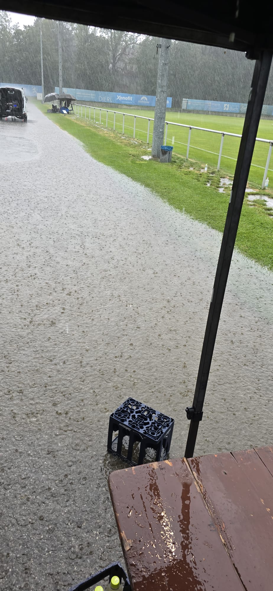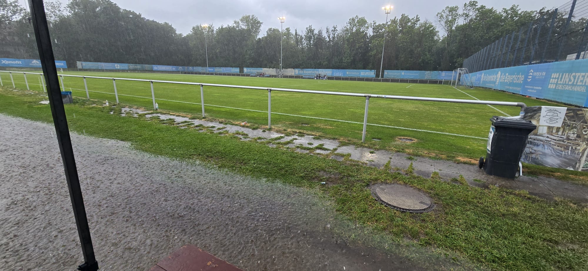 Wenig verändert ging die Partie nach dem Wiederanpfiff weiter. Die Blauen taten sich schwer gegen einen abgeklärt auftretenden Gegner, der aber seinerseits auch keine besonders starke Leistung zeigte. Als um zwanzig nach vier das Flutlicht am Fünferplatz angeschaltet wurde, schwante den zahlreichen Besuchern nichts gutes. Kurz später setzte leichter Regen ein, der sich innerhalb kürzester Zeit zu einem echten Wolkenbruch entwickelte. Punkt 16.30 Uhr, gespielt waren inzwischen 68 Minuten, pfiff Schiedsrichter Koray Aydin die Partie (vorübergehend) ab und bat die Akteure in die Kabine. Die Zuschauer verließen eilig den Platz und suchten Schutz, wo immer man Schutz vor dem Starkregen finden konnte. Die Mehrheit von ihnen dürfte dennoch nass bis auf die Knochen geworden sein. Um kurz nach fünf war der nächste Spielabbruch am Trainingsgelände innerhalb weniger als vier Wochen offiziell.