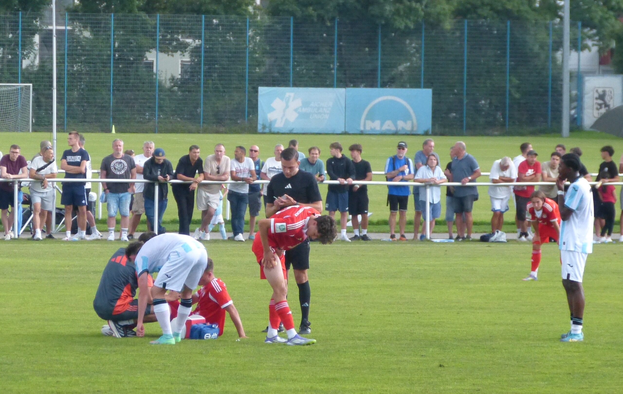 Erst 26 Tage ist es her, dass das Heimspiel der Amas (gegen TuS Geretsried) wegen eines Wolkenbruchs und der daraus folgenden Unbespielbarkeit des Platzes am Trainingsgelände an der Grünwalder Straße 114 nach einer Stunde abgebrochen werden musste. Heute Nachmittag wiederholte sich das Szenario in ganz ähnlicher Weise. Allerdings lag das Team der Löwen heute nicht – wie am 25. Juli – mit 1:0 in Front, sondern 1:2 gegen den Nachwuchs aus der Seitenstraße zurück. Das U19-Derby in der DFB-Nachwuchsliga wurde in der 68. Spielminute abgebrochen. Ein Nachholtermin ist naturgemäß noch nicht bekannt.
