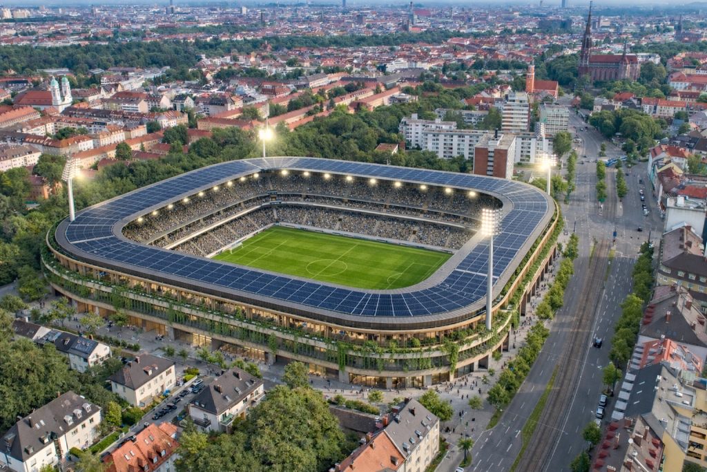 Entwurf – Bild 2 u. 4 sind bei mir die Favoriten u. gefallen mir am besten. Die Überdachung sollte wie hier selbstverständlich komplett mit Solaranlage versehen werden – ein Ökostadion so gut u. wirtschaftlich es geht. Ich würde letztendlich die Variante 2 – “Grüner Beton” – am besten finden, wo 2 o. 3 Zuschauerbereichsstufen übereinander gebaut u. eingerückt werden, was im Umfang Platz spart, den wir ums Sechzger eh nicht groß haben, trotzdem aber die Zuschauerkapazität maximal vergrößern könnte, Business Seats u. anderen guten Vernarktungsmöglichkeiten mehr Platz bietet u. zudem zusammen mit der Überdachung bestimmt auch den besten Schallschutz nach außen erreicht.