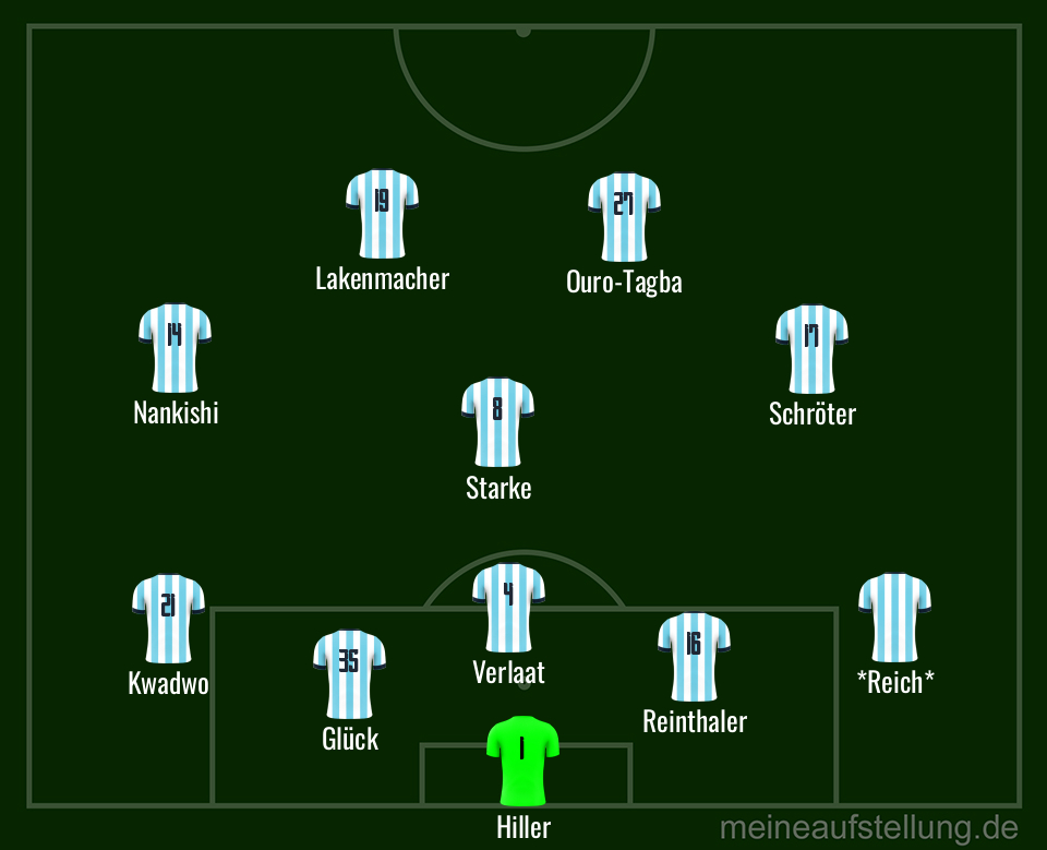 Stefan setzt auch auf das altbekannte 4-2-3-1, nimmt jedoch ebenfalls Änderungen an der Startelf vor. Im defensiven Mittelfeld sollen Frey und Starke für Ordnung sorgen, über links soll – wie schon gegen Dortmund II – Ouro-Tagba für Schwung sorgen. Die große Überraschung findet sich im Sturm, wo Winterneuzugang Serhat-Semih Güler in seinem Heimatbundesland von Anfang an ran darf.