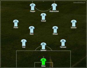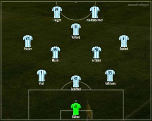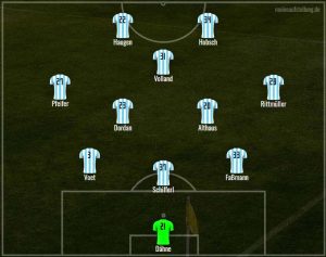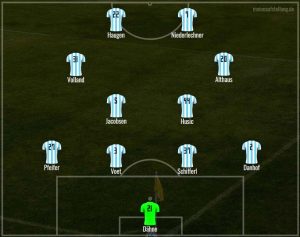 In einem 4-2-2-2 lässt Stefan die Löwen los und setzt in der Abwehr auf die Viererkette mit Pfeifer, Voet, Schifferl und Danhof. Davor bilden Thore Jacobsen und der junge Loris Husic die Doppelsechs. Samuel Althaus rückt eine Position nach vorne und soll zusammen mit Kevin Volland die beiden Stürmer mit Vorlagen füttern.
