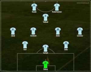 Bis auf den Sturm wäre ich am ehesten bei Kranzberg, aber, wir haben ein Heimspiel deshalb weg vom massieren Mittelfeld, keine 2 Sechser: